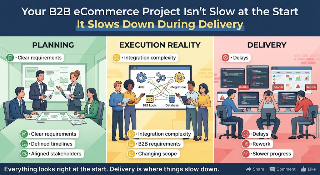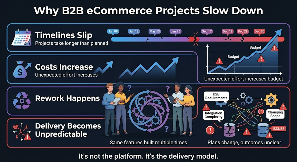 Most B2B eCommerce projects don’t slow down because of technology. They slow down because of how they’re delivered.