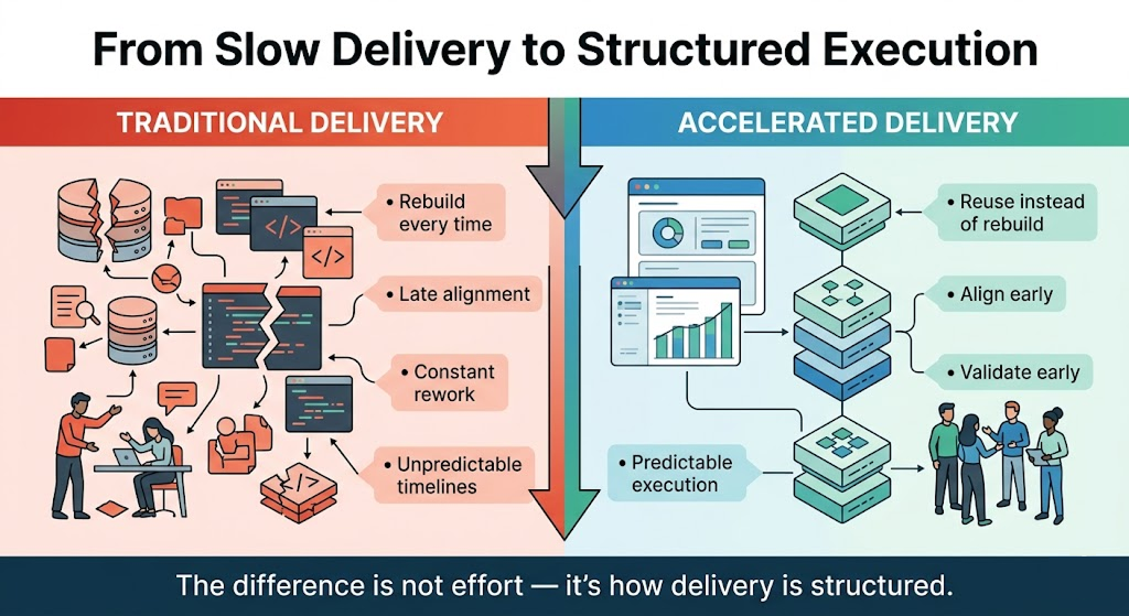 Real acceleration doesn’t come from doing more work. It comes from eliminating unnecessary work and structuring delivery in a smarter way,through reuse, early alignment, and better workflows.