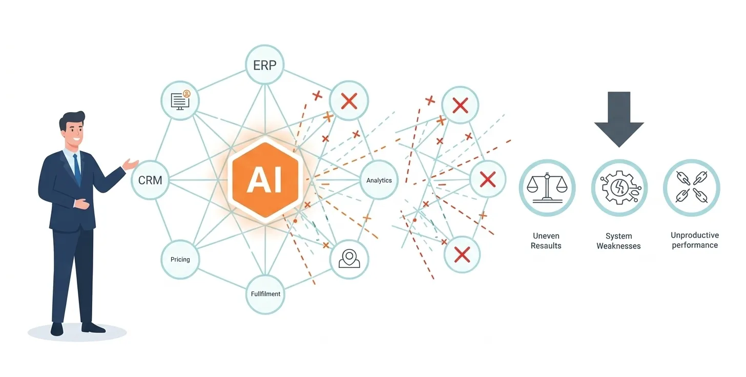 In most B2B environments, systems are deeply interconnected. ERP platforms, CRM systems, pricing engines, fulfillment infrastructure, and analytics layers have been layered over time. Introducing intelligent automation into that ecosystem without coordinated preparation can produce uneven results. Some initiatives perform well in controlled settings. Others surface weaknesses that previously remained manageable.
