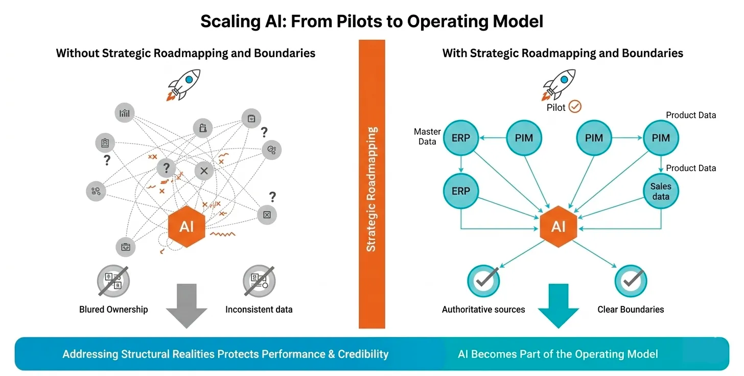 AI introduced into unclear ownership structures amplifies inconsistency. Roadmapping clarifies authoritative sources and system boundaries before intelligence is layered onto the environment.
