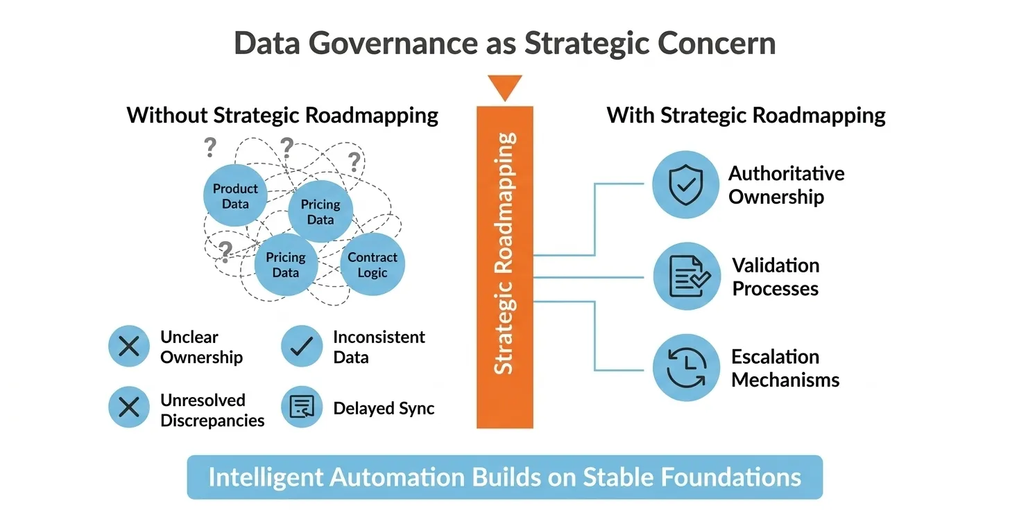 Foundational reliability, consistent pricing logic, synchronized inventory data, defined approval workflows must operate predictably before intelligent automation expands.