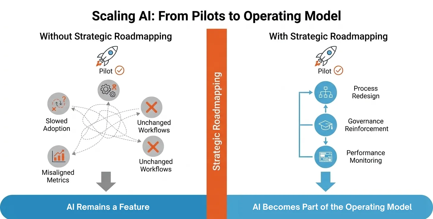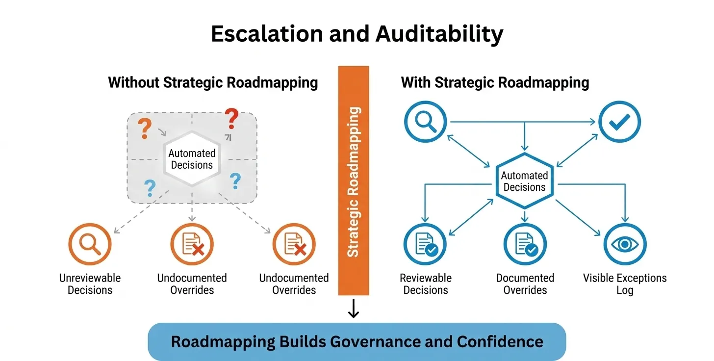 Strategic roadmapping clarifies the boundaries of automation before deployment. It defines review processes, override authority, and performance ownership in advance.