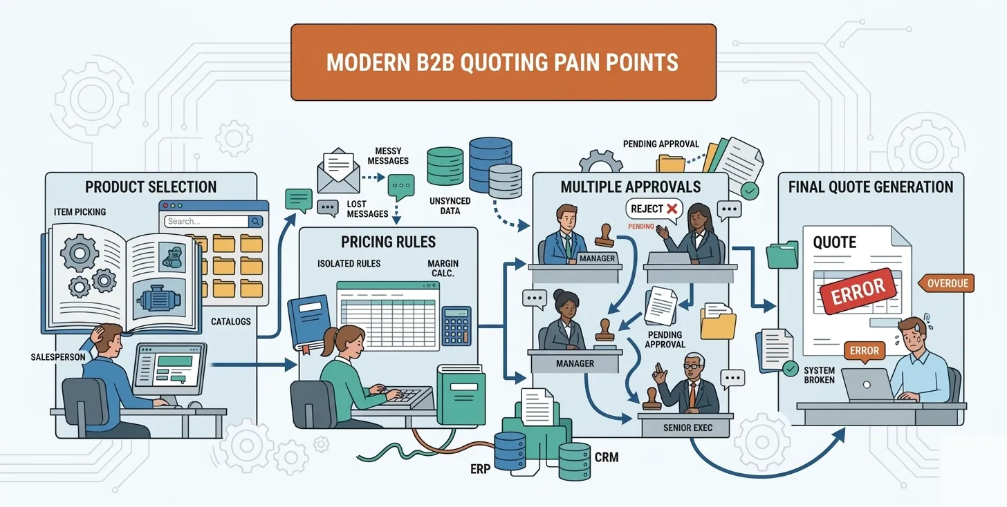 Quoting sits at the center of the B2B sales process, connecting product selection, contract based pricing, internal approvals, and the final purchase decision.