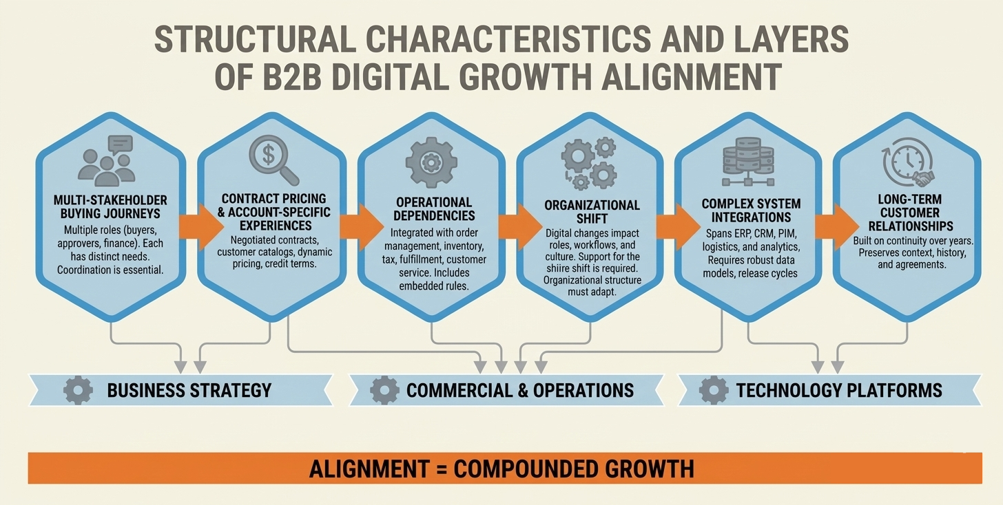 B2B digital growth unfolds in an environment where scale, complexity, and coordination increase simultaneously. Progress is rarely driven by optimizing a single experience or channel. Instead, it depends on how well multiple commercial, operational, and technical layers evolve together over time. Several structural characteristics make B2B digital growth inherently more demanding.