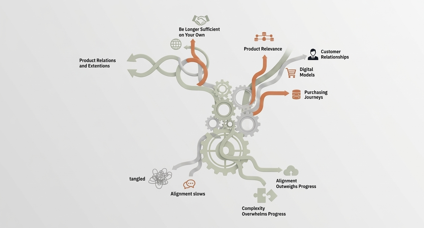 B2B organizations operate under constant performance pressure. Quarterly targets, customer demands, and operational constraints encourage short-term fixes. Without a guiding roadmap, these decisions accumulate. What begins as pragmatic adaptation gradually hardens into structural constraint — limiting flexibility, increasing cost, and slowing future growth.