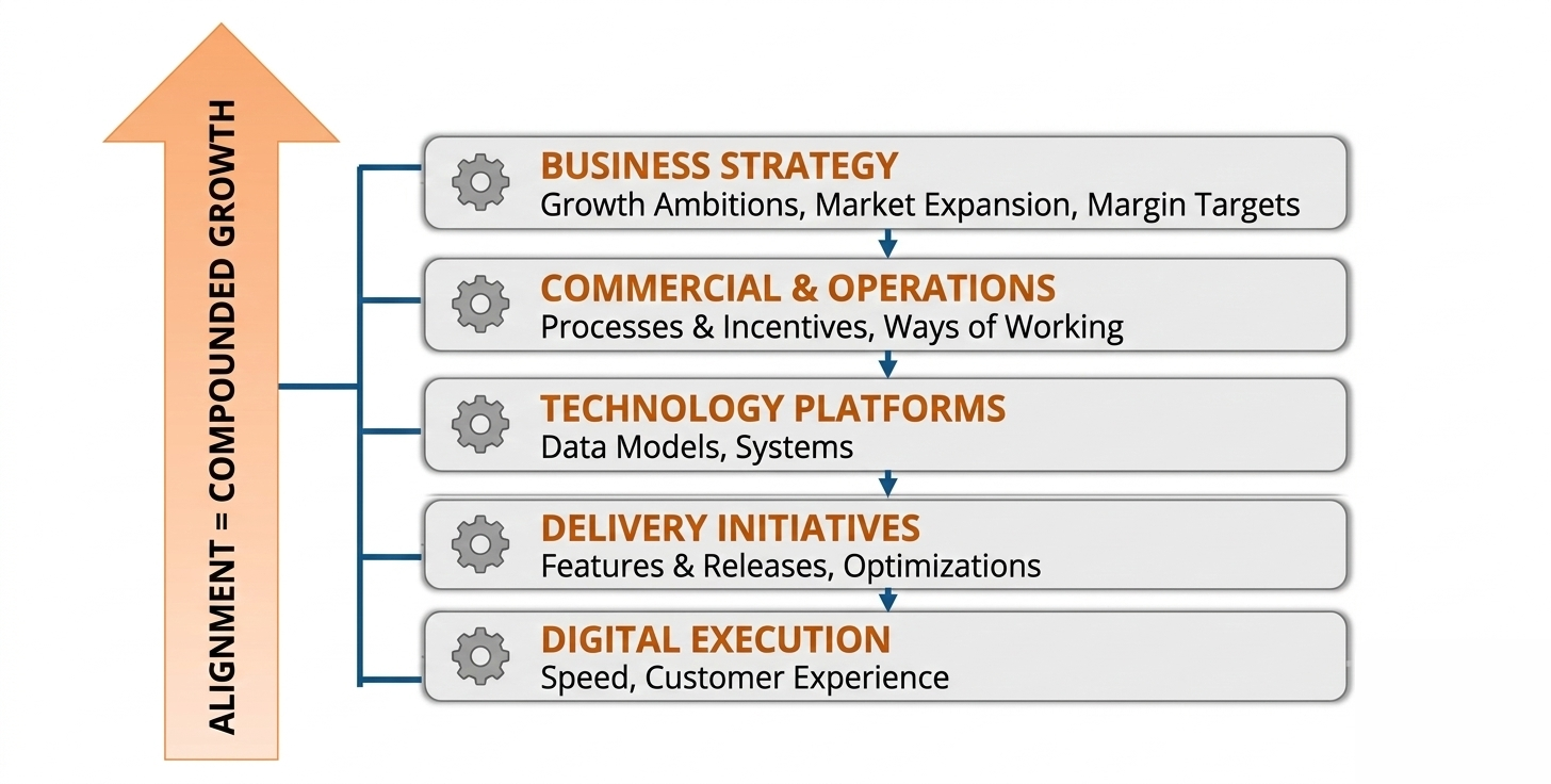 At the top, business leadership defines growth ambitions: market expansion, customer segments, margin targets, or service differentiation. Below that, commercial and operational teams translate those ambitions into processes, incentives, and ways of working. Technology teams then select platforms, integrations, and data models to support execution. Finally, delivery teams turn these decisions into features, releases, and optimizations.