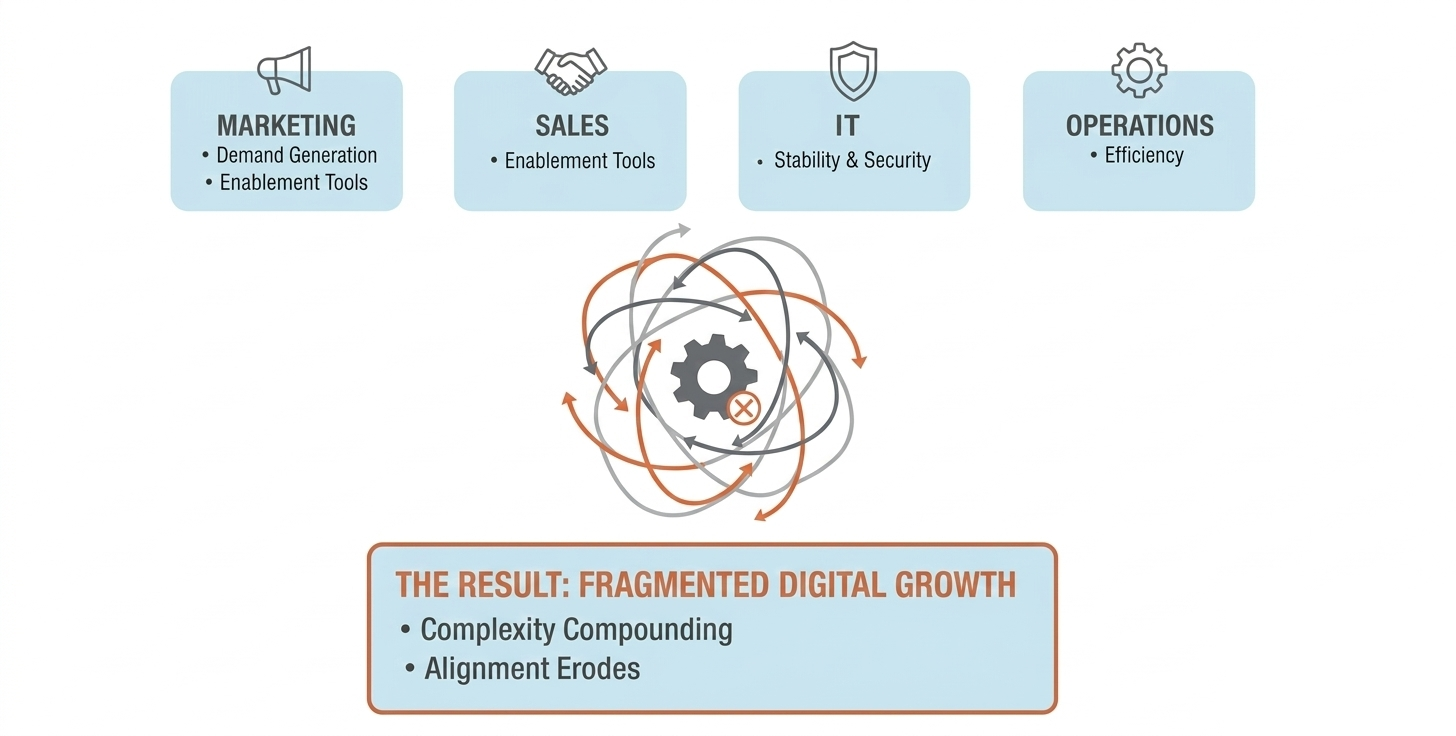In the absence of a strategic framework, teams naturally optimize from their own vantage points. Marketing focuses on demand generation, sales pushes for enablement tools, IT prioritizes stability and security, and operations pursue efficiency. Each decision is rational in isolation.
