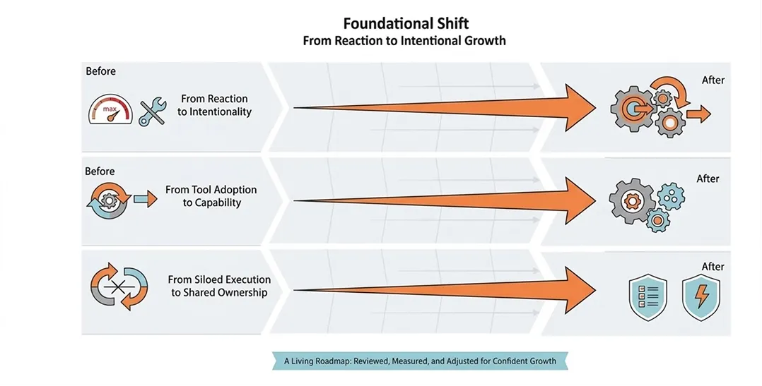 Without a shared strategic roadmap, even well-executed initiatives struggle to compound. Decisions are made in isolation, trade-offs remain implicit, and effort disperses across competing priorities. Activity increases, but momentum weakens.