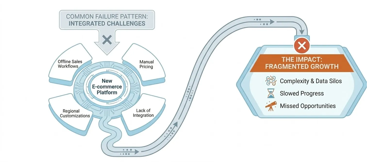 When this hierarchy is aligned, digital investments reinforce one another. When it is not, progress becomes fragile. A common failure pattern looks like this: a B2B organization invests in a new eCommerce platform to improve customer experience and scalability. At the same time, sales continues to operate on account-specific workflows built for offline processes, pricing remains managed outside the digital stack, and regional teams customize the platform to meet local needs. Each decision is defensible in isolation. Collectively, they create a system where digital channels cannot fully support the business model.