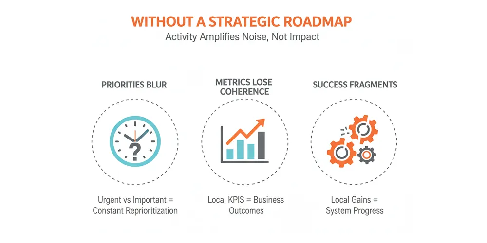 Without a strategic roadmap to provide context, increased activity amplifies noise rather than impact. Decisions are made faster, but not necessarily in the right direction.