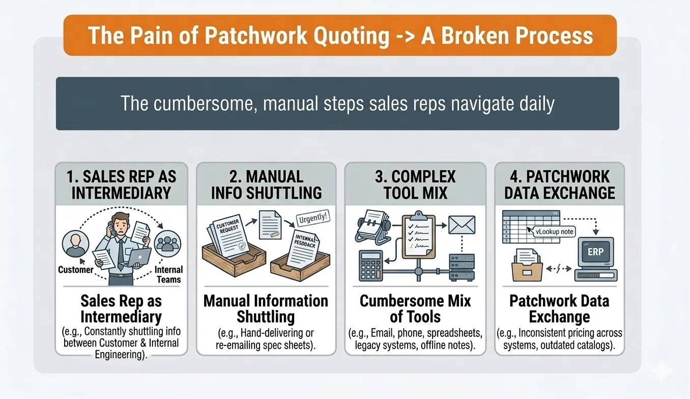 In many B2B organizations, quoting is far from a streamlined, efficient system—it remains a patchwork of manual, disconnected steps. Sales reps often serve as intermediaries, shuttling information between customers and internal teams while assembling quotes through a cumbersome mix of tools and channels.