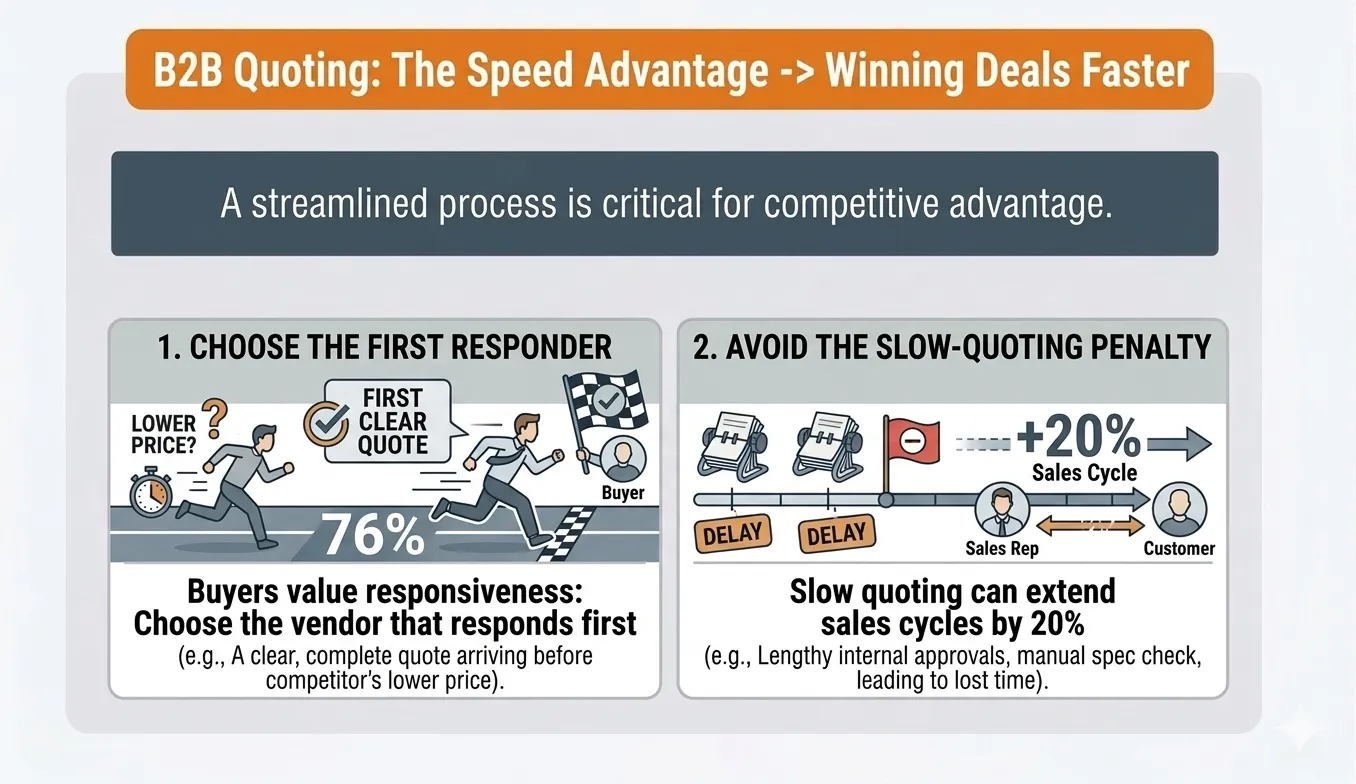 • 76% of B2B buyers choose the vendor that responds first with a clear quote—even if it’s not the lowest price