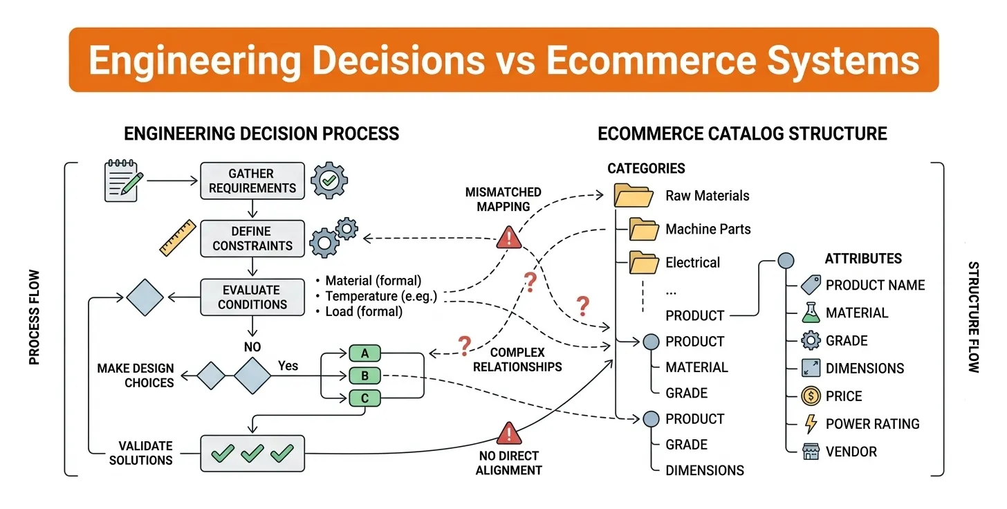 Engineering decisions begin with the conditions in which a product will operate. Catalog systems begin with the product itself and its defined attributes.